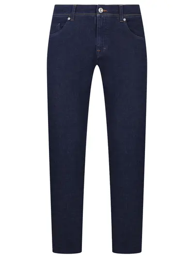 -Синие джинсы из смесового хлопка от CASTANGIA. -Модель стандартного кроя и посадки с поясом со шлевками, прорезными и накладными карманами, застежкой на молнию и пуговицу, нашивкой с логотипом бренда сзади.
