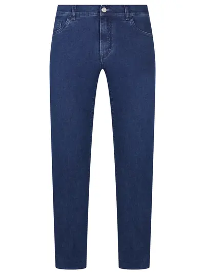 -Синие джинсы из смесового хлопка от CASTANGIA. -Модель стандартного кроя и посадки с поясом со шлевками, прорезными и накладными карманами, застежкой на молнию и пуговицу, нашивкой с логотипом бренда сзади.