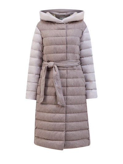 Удлиненный женский пуховик от Hetrego создан в стиле colorblock в нейтральной меланжево-пудровой гамме. Комбинированная модель сочетает плотную кашемировую фланель и водонепроницаемый нейлон, утепляющая прослойка из пуха и пера обеспечивает максимальный комфорт в зимний сезон. Съемный двусторонний пояс в тон позволяет индивидуально сформировать силуэт. Детали: глубокий капюшон, прорезные карманы, двойная линия застежки, внутри на подкладке.