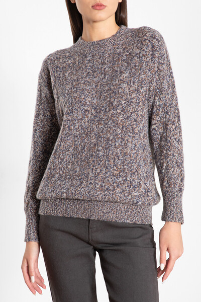 Разноцветный свитер фактурной вязки от бренда Kiton. Изделие выполнено из мягкого кашемира и дополнено круглым вырезом горловины на резинке. Для производства пряжи используется вычесанный вручную и очищенный от грубых волокон нежный пух горных коз, поэтому вещь получилась лёгкой и при этом невероятно тёплой. На принадлежность бренду указывает металлическая планета с выгравированным логотипом спереди.