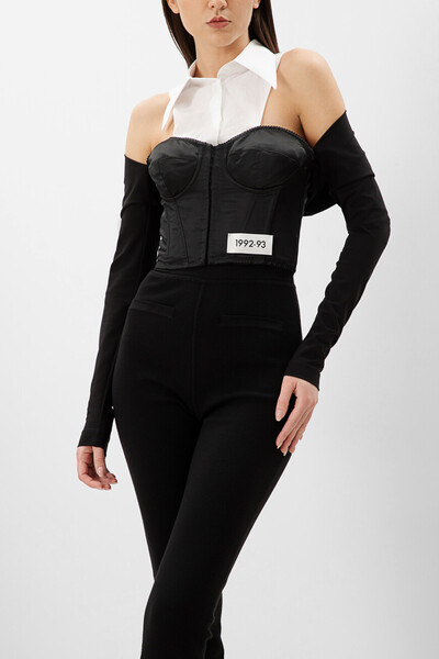 Роскошный топ-корсет из джерси, атласа и поплина от Dolce & Gabbana. Эффектная «трёхъярусная» модель оригинальной конструкции: основная часть топа на косточках выполнена из прочного эластичного нейлона чёрного цвета, средняя часть - представляет собой фрагмент белой классической хлопковой рубашки, а верхняя часть изделия визуально напоминает накидку-болеро с длинными рукавами, которую можно приспустить, приоткрыв плечи. Показ весенне-летней коллекции 2023 года представляет историю Dolce&Gabbana от самых истоков, по-новому интерпретируя итальянский стиль, женственность и чувственность. Встреча с Ким Кардашьян, современной иконой стиля и красоты, послужила началом увлекательного и чудесного сотрудничества: созданная в результате вневременная коллекция обновлена и переосмыслена с учётом потребностей новых поколений.