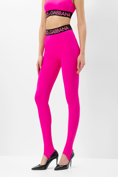 Леггинсы Dolce&Gabbana с широким брендированным поясом на резинке. Для создания модели облегающего кроя выбран прочный эластичный нейлон в оттенке фуксия. Изделие, выполненное в спортивном стиле, отличается застёжкой на потайную молнию сзади. Образ можно дополнить коротким топом без рукавов из той же коллекции.