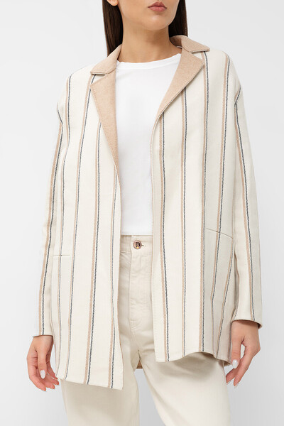 Двусторонний кашемировый жакет прямого силуэта от бренда Loro Piana. Одна сторона изделия выполнена в белом цвете и дополнена полосатым геометрическим мотивом, а другая окрашена в бежевый оттенок и также декорирована белым диагональным узором в полоску. Элегантная модель на запах характеризуется изящным V-образным вырезом горловины и боковыми карманами.