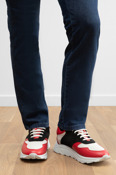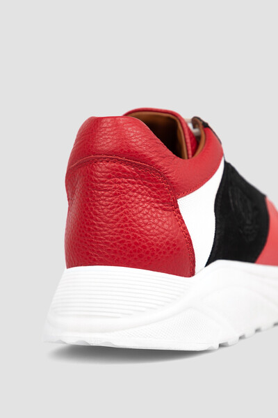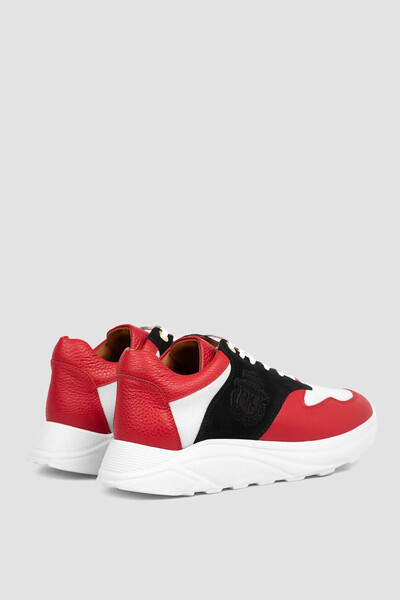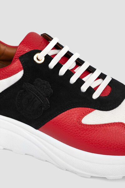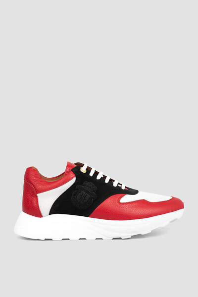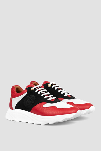 Яркие стильные мужские кроссовки Billionaire из мягкой натуральной зернистой кожи красного цвета со вставками из мягкой чёрной замши и белыми контрастными вставками из микросетки. Модель с комфортной колодкой, закрытой белой шнуровкой и объемной контрастной белой подошвой с фирменным рифлением и нескользящим покрытием. Боковины украшены фирменными лого бренда.
