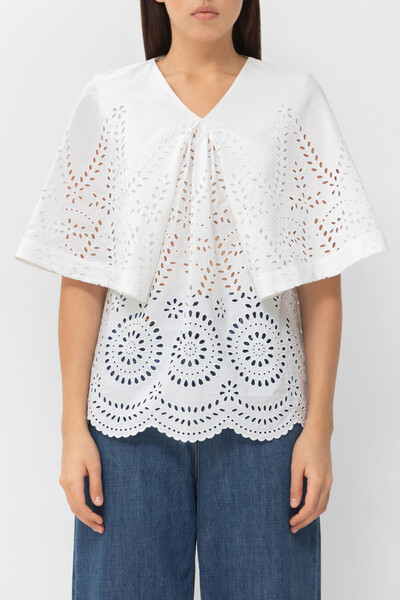 Женский топ от британского бренда STELLA McCARTNEY. Изготовлен из прочного, натурального полотна. Хлопковая ткань мягкая и очень комфортная для жаркой погоды. Изделие «дышит» и отлично впитывает влагу. Модель прямого кроя со сложной дизайнерской конструкцией верха. Рукава средней длины спереди соединятся в «пелерину». Изделие украшено изящной ажурной прорезной вышивкой. Топ отлично будет смотреться с брюками и юбками из той же коллекции. Стиль – casual или smart casual.