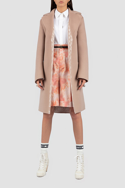 Бермуды из нежной шелковой тафты от Dior. Изделие прямого кроя выполнено в оттенке розового пиона и дополнено повторяющимся мотивом в виде кораллов. Модель оснащена четырьмя карманами и застёгивается на молнию и брендированный крючок с планкой.