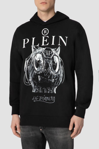 Роскошное мужское худи Philipp Plein из мягкого трикотажа на основе хлопка и прочного синтетического износостойкого материала универсального чёрного цвета. Ультрамодная модель комфортного прямого кроя, с длинными рукавами с манжетами на резинке, объёмным капюшоном, двумя прорезными карманами по бокам и широкой манжетой снизу с фактурой в рубчик. Спереди красуется крупный контрастный серо-белый дизайнерский принт с объёмным логотипом, чуть выше присутствует крупная белая надпись бренда, ниже изделие также украшает светло-серая дизайнерская надпись, а сзади на капюшоне расположилась вставка из сафьяновой кожи PP Hexagon с фирменной серебристой металлической монограммой в центре.