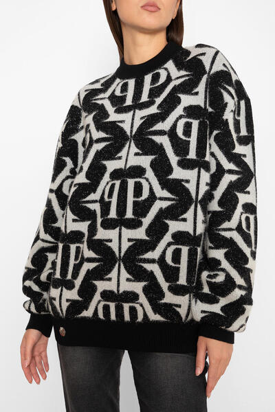Женский пуловер Philipp Plein на основе натуральной шерсти и нейлона. Изделие выполнено в чёрном цвете. Отличительные особенности: повторяющийся мотив с лого-монограммой и металлическая вставка-шестигранник с символикой бренда спереди.