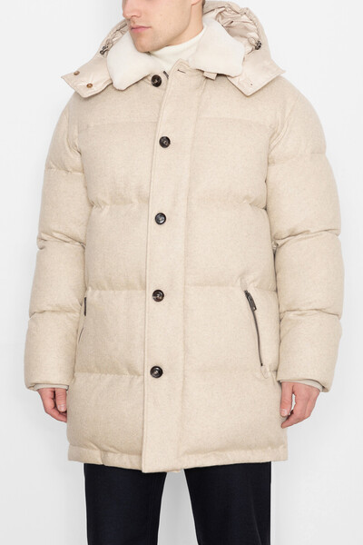 Стёганая куртка на молнии и крупных роговых пуговицах от Brioni. Изделие выполнено из мягкого кашемира и натуральной шерсти песочного оттенка. Надёжную защиту от холода и ветра обеспечивают отложной воротник из меха овчины и наполнитель из двух видов материалов: из полиэстера и натурального утиного пуха и пера.