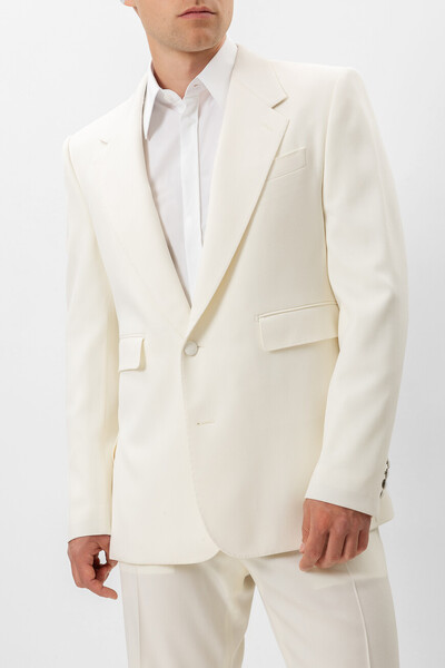 Белый пиджак из натуральной вирджинской шерсти стрейч от Dolce & Gabbana. Коллекция «Stile» сезона весна-лето 2024 отражает уникальный и неповторимый стиль Модного Дома, возвращение к своим корням и культовой ДНК бренда. Отличительной особенностью модели стали изящные боковые разрезы снизу. Изделие смотрится гармонично в сочетании с хлопковой сорочкой и брюками с классическими стрелками из той же коллекции.