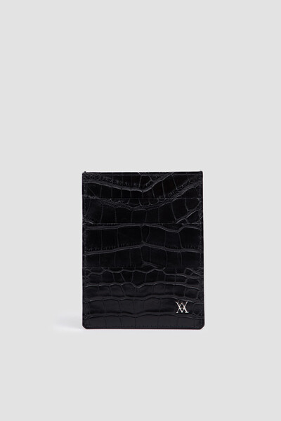 Чёрная кредитница Artioli с тремя слотами для пластиковых карт. Модель изготовлена из натуральной фактурной кожи крокодила. Атрибутами бренда стали серебристый металлический лого-монограмма на лицевой стенке и тиснёные логотип и монограмма сзади.
