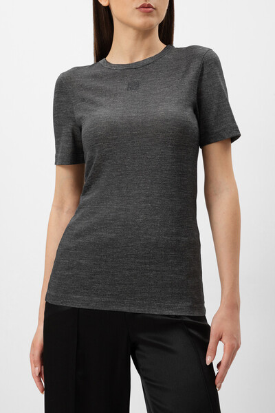 Меланжевая футболка LOEWE с узлом сзади. Модель изготовлена из мягкого трикотажа на основе хлопка и прочного вискозного волокна тёмно-серого цвета. Грудь украшает рельефная вышивка в виде анаграммы бренда, а спинка декорирована глубоким разрезом сверху. Образ можно дополнить чёрными брюками в пижамном стиле и миниатюрной сумкой-тоут Font из той же коллекции.