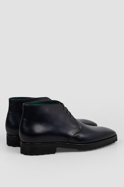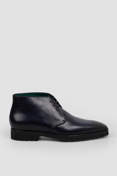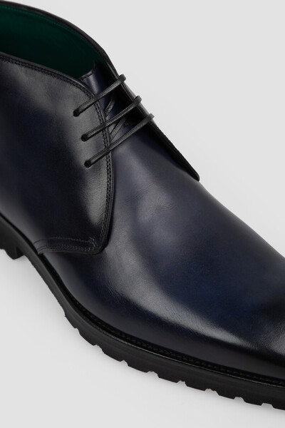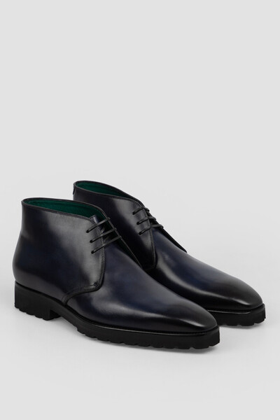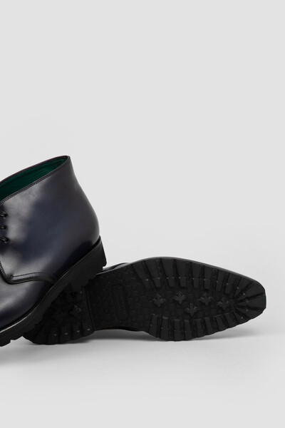 Кожаные дерби тёмно-синего цвета от Stefano Ricci. Модель с открытой функциональной шнуровкой интересна патиной и наличием объёмной чёрной подошвы из натуральной резины с крупным протектором для надёжного сцепления с дорогой. Изделие на широком устойчивом каблуке станет неотъемлемой частью демисезонного гардероба мужчины.