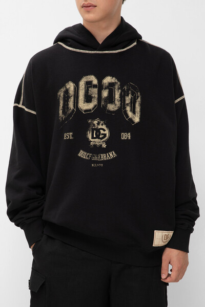 Худи Dolce & Gabbana с глубоким капюшоном. Коллекция Palermo вдохновлена стилем 1940-х и 1950-х годов и представляет собой связь между миром сицилийского мужчины (тёплые оттенки: песочный, кремовый) и нетронутой природой острова (чёрный Nero Sicilia с цветочными мотивами и культовыми принтами). Для пошива модели силуэта oversize выбран мягкий хлопковый трикотаж чёрного цвета, поддерживающий оптимальный микроклимат. С выведенными наружу тщательно проработанными швами кремового оттенка зарифмован потёртый брендированный логотип спереди, придающий изделию винтажный вид.