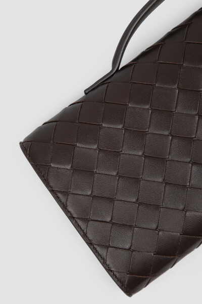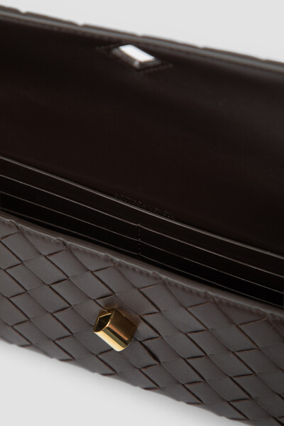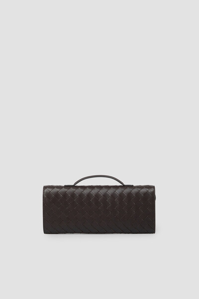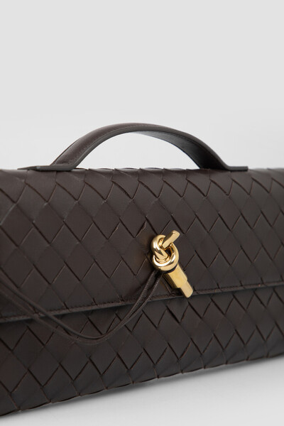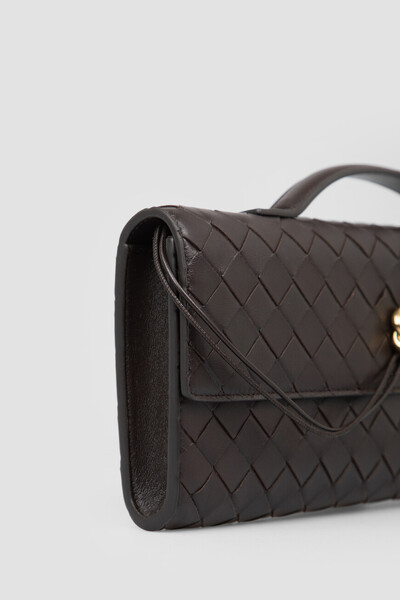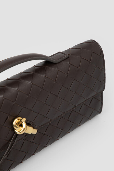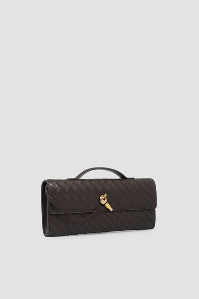 Вытянутый клатч Andiamo тёмно-коричневого цвета от BOTTEGA VENETA. Прямоугольный аксессуар среднего формата изготовлен из мягкой кожи, отполированной вручную до деликатного блеска. Роль декора отдана фактурному плетению из широких полос в фирменной технике «Intrecciato». Отличительной особенностью модели также является тонкий кожаный ремешок с крупной застёжкой-«узлом» из золотистой латуни спереди.