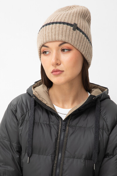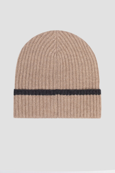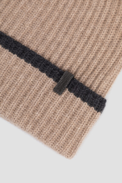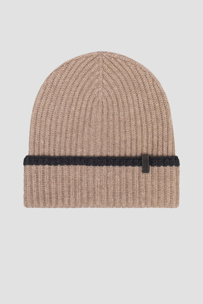 Кашемировая шапка бини бежевого оттенка от BRUNELLO CUCINELLI. Аксессуар связан английской резинкой и дополнен широким эластичным отворотом, который надёжно фиксирует изделие на голове и не передавливает кожу. Декором выступают кант и петля из рядов блестящих знаковых цепочек Мониль на отвороте. Модель станет превосходным дополнение образа и с пальто, и со спортивной курткой.
