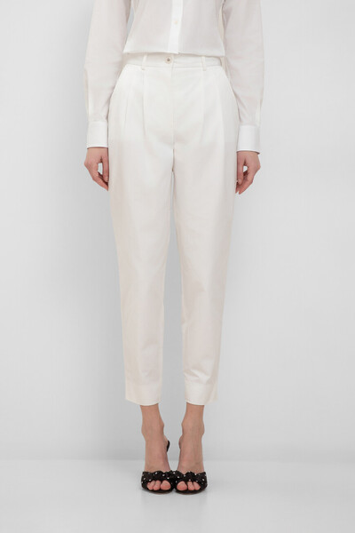Укороченные брюки Dolce & Gabbana задают новые стандарты в мире моды. Изделие сшито из лёгкого хлопкового трикотажа белого цвета и дополнено двойными защипами сверху. Модель с завышенной линией талии застёгивается на потайную молнию и крупную перламутровую пуговицу с планкой и отличается наличием четырёх карманов. Брюки можно сочетать с классической белой сорочкой и ремнём с крупной дизайнерской пряжкой, стилизованной под DG-монограмму.