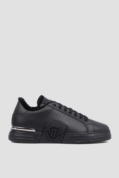 Утеплённые сникеры LO-TOP от бренда Philipp Plein. Для создания модели с широкой колодкой выбрана чёрная кожа наппа. Отличительными особенностями пары стали перфорация по бокам и серебристая металлическая вставка сзади над подошвой. О принадлежности изделия Дому напоминают вставка с белыми надписью «PLEIN» и культовым черепом на язычке и прорезиненные детали с рельефными лого-монограммами в шестиграннике PP Hexagon на боковинах.