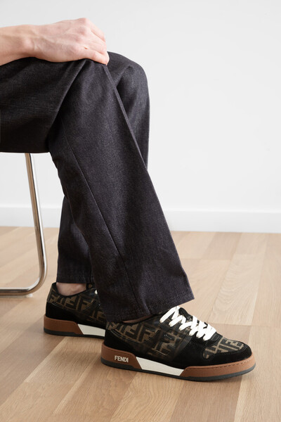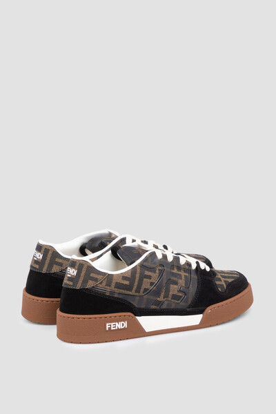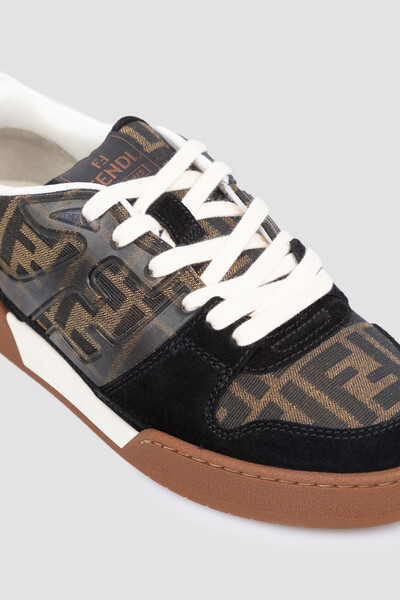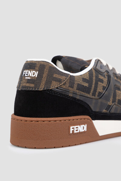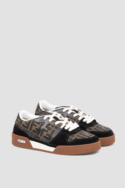 Комбинированные кроссовки Fendi Match с культовой символикой Дома. Для изготовления модели из коллекции, созданной при участии дизайнера Стефано Пилати, выбраны плотная холщовая ткань и бархатистая замша. Отличительными деталями стали жаккардовый мотив «FF» в коричневой гамме, прорезиненная аббревиатура «FF» на боковинах и белый рельефный логотип на подошве. Обувь оснащена закрытой перекрёстной шнуровкой и внутренней отделкой из прочного белого полиэфира.