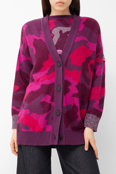 Эффектный женский кардиган ICEBERG из мягкого трикотажа на основе прочного синтетического износостойкого материала, фирменного нейлона, натуральной шерсти, фирменного кашемира, вискозного волокна и пряжи из шерсти ангорской козы (мохера) с оригинальным камуфляжным узором в розовых оттенках по всей поверхности изделия. Стильная удлиненная модель комфортного прямого кроя, с изящным V-образным вырезом горловины с фактурой в рубчик, длинными рукавами со спущенным плечом и серыми манжетами на резинке с заметным меланжем, удобной застёжкой на крупные контрастные роговые пуговицы и широкой манжетой снизу также с фактурой в рубчик. Фишка изделия: контрастная светло-розовая нашивка-патч с вышитой чёрной фирменной надписью бренда на левом рукаве. Превосходное дизайнерское решение, отличающее кардиган от остальных моделей - крупный яркий дизайнерский принт с Даффи Даком - персонажем мультсериала “LOONEY TUNES” на спинке сзади.