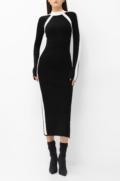 Платье Patrizia Pepe выполнено в чёрно-белой гамме. Длинная модель изготовлена из мягкого трикотажа на основе прочного нейлона и вискозного волокна с двухцветным оптическим эффектом. Декором выступают декоративные символы Fly снизу на рукавах. Изделие облегающего силуэта с боковым разрезом слева подчеркнёт Вашу женственность и будет сочетаться с белой кожаной сумкой Fly Bamby и ботильонами на полупрозрачной фигурной скале от Dior.