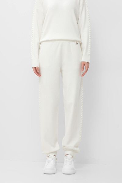 Джоггеры свободного силуэта от Patrizia Pepe. Фасон изделия из мягкой смесовой вискозы белого цвета с добавлением эластичных волокон предполагает широкий эластичный пояс-резинку и боковые карманы. Отличительными деталями стали отделка с эффектом ручного плетения по бокам и декоративный символ Fly, расположенный спереди. Брюки прекрасно подойдут для создания динамичного образа в стиле кэжуал и будут сочетаться с джемпером из той же коллекции.