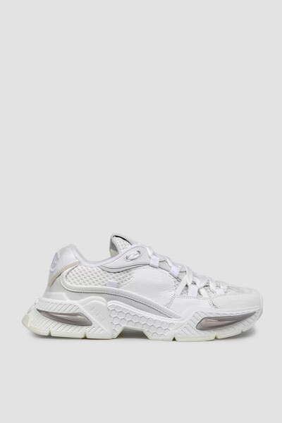 Комбинированные сникеры Airmaster от Dolce & Gabbana. Модель изготовлена из трёх видов материалов белого цвета: прорезиненной матовой кожи телёнка, эластичного сетчатого текстиля на основе прочного полиэфира, вискозного волокна, нейлона и упругого полиуретана с плотным переплетением и вставкой из бархатистой замши на носке. Пара дополнена ворсистой внутренней отделкой из полиэстера, идеально подходит для носки в свободное время и почти не ощущается на ногах. Верх обуви хорошо пропускает воздух, не допуская перегрева, а широкая подошва со светоотражающими полупрозрачными вставками мягко пружинит и гасит удары при ходьбе, равномерно распределяя нагрузку на суставы.