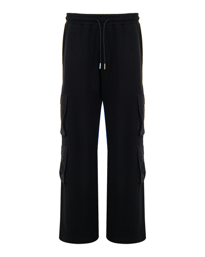 Спортивные брюки из хлопка с эластичным поясом и шнурком. Снизу манжеты без резинки свободного прямого кроя. По бокам расположены два врезных кармана, а на штанинах нашили накладные карманы с клапанами. Для вечерней прогулки брюки можно сочетать с худи и укороченной курткой