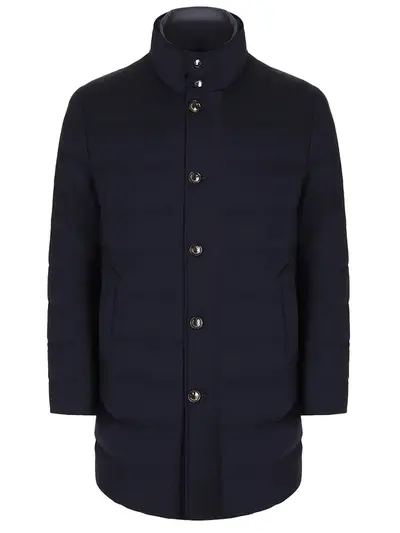-Синий удлиненный стеганый пуховик от MONTECORE. -Модель прямого кроя с длинными рукавами, прорезными карманами, воротником-стойкой, застежкой на пуговицы. -Внутри предусмотрена съёмная стеганая с застежкой на молнию. -Благодаря стежке наполнитель равномерно распределен внутри изделия и лучше сохраняет тепло.