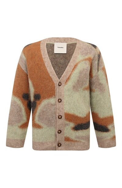 Кардиган Nessin с абстрактным мотивом выполнили из смесовой пряжи с добавлением шерсти овцы и альпака. Модель с V-образным вырезом обработали щетками, чтобы придать пушистую фактуру.