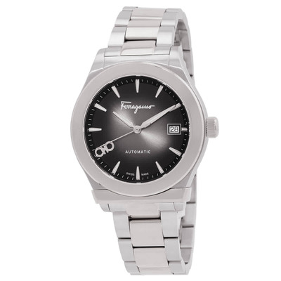 Silver-tone stainless steel case and bracelet. Fixed silver-tone stainless steel bezel. Black dial with silver-tone hands and index hour markers. Double-gancio symbol at the 8 o'clock position. Dial Type: Analog. Date display at the 3 o'clock position. Automatic movement. Scratch resistant sapphire crystal. Pull / push crown. Solid case back. Round case shape, case size: 42 mm. Butterfly clasp. Functions: date, hour, minute, second. 1927 Series. Casual watch style. Watch label: Swiss Made. Ferragamo 1927 Automatic Black Dial Mens Watch SFU800224.