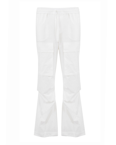 Брюки свободного кроя на эластичной резинке с шнурком сшили из 100% хлопка. Модель с прорезными и двумя накладными карманами спереди и двумя накладными сзади.