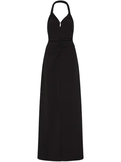 black stretch-design rear zip fastening halterneck V-neck sleeveless draped detailing fitted waistline floor-length