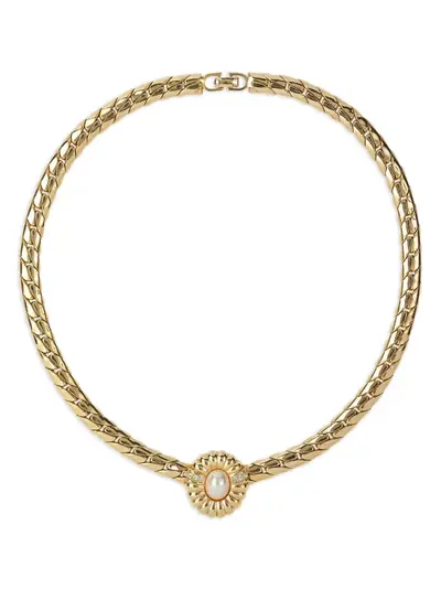 circa 1980s gold plated flat-weave chain faux-pearl embellishment Swarovski crystal embellishment clasp fastening Normal everyday use and external agents may reduce the lustre of gemstones and gold surfaces. To maintain, use specific, non-abrasive products specially meant for cleaning jewellery.