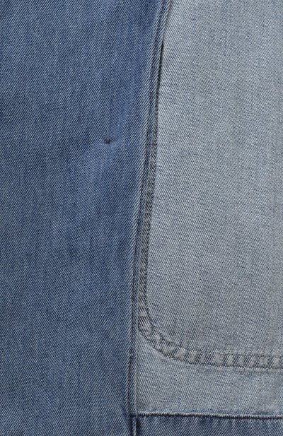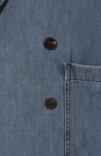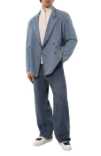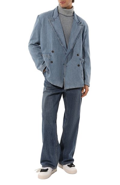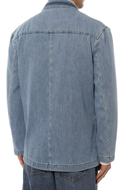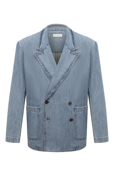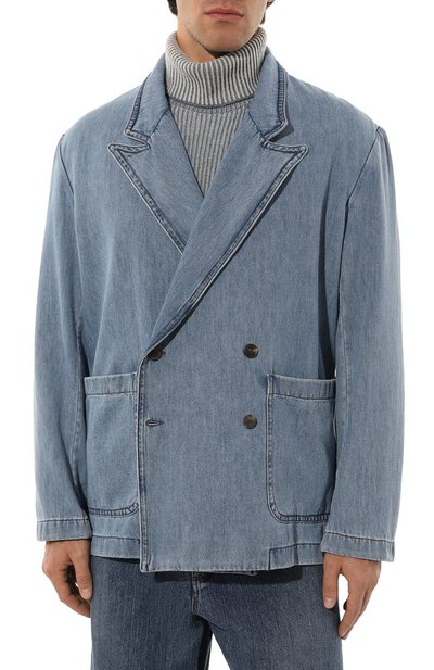 Для пошива двубортного пиджака выбрали деним из чистого хлопка. Модель с боковыми карманами выполнили без подклада, поэтому она формирует мягкий силуэт.