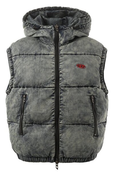 Укороченный жилет W-Mons-Sl с эластичными низом и проймами сшили из денима стрейч с добавлением вискозы и полиэстера. Выбеленную модель на синтетическом утеплителе дополнили регулируемым капюшоном, боковыми карманами с молниями и еще одним внутри. Спереди – вышитая алыми нитями эмблема Oval D.