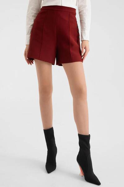 Красные шорты Dior со стрелками выполнены из шерсти и шелка. Модель расклешенного кроя с комфортной посадкой на талии дополнена стрелками, зрительно удлиняющими силуэт. Лаконичный декор — черные пуговицы на боковых швах — выполняет функцию застежки. Шорты составят комплект с красным пиджаком из той же коллекции.