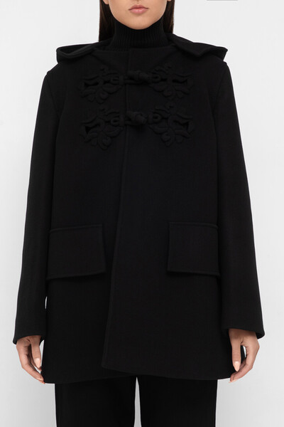 Чёрный бушлат VALENTINO на двух удлинённых пуговицах в тон. Эта модель - яркий пример того, что можно найти компромисс между комфортом и модой. Изделие выполнено из мягкой вирджинской шерсти и дополнено глубоким отстёгивающимся капюшоном. Пальто прямого силуэта отличается крупными декоративными элементами спереди, к которым крепятся петли застёжки.