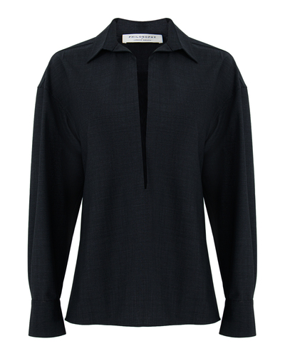 Блуза из трикотажной ткани с глубоким вырезом и отложным воротником. Модель прямого кроя и спущенной линия плеча. Широкие манжеты на рукавах с застежкой на пуговицы. Блузу идеально сочетать с топом или тонкой водолазкой. Завершить образ можно классическими брюками или джинсами.