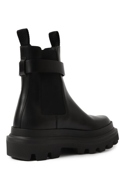 Челси на массивной подошве с протектором изготовили из телячьей кожи. Голенище с текстильными петлями украсили ремешком с металлической пластиной и объемной монограммой DG.