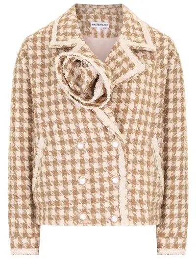 -Бежевый с узором двубортный жакет из фактурного твида с люрексом от MASTERPEACE.