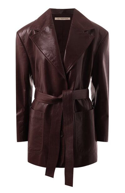 Жакет со шлицей сзади выполнили из полуглянцевой кожи и дополнили вискозной подкладкой. Модель с двумя накладными карманами и съемным поясом-лентой застегивается пуговицами в тон.