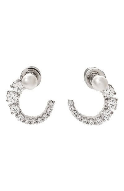 Пусеты из линии Matrix выполнили из латуни с гальваническим покрытием родием и украсили перламутровой жемчужиной Crystal Pearl. Серьги дополнили деталью в виде полукольца, инкрустированного кристаллами.