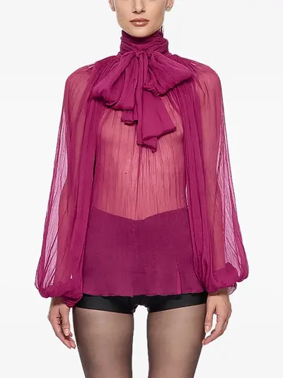 fuchsia pink silk chiffon crepe attached scarf V-neck long raglan sleeves elasticated cuffs finished edge
