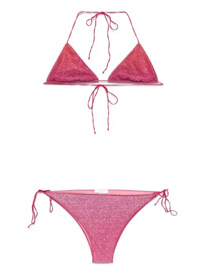 shocking pink stretch-design metallic threading lurex detailing rear tie fastening halterneck tie fastening triangle cup spaghetti straps side-tie bottoms full lining Be mindful to try on swimwear over your own garments.