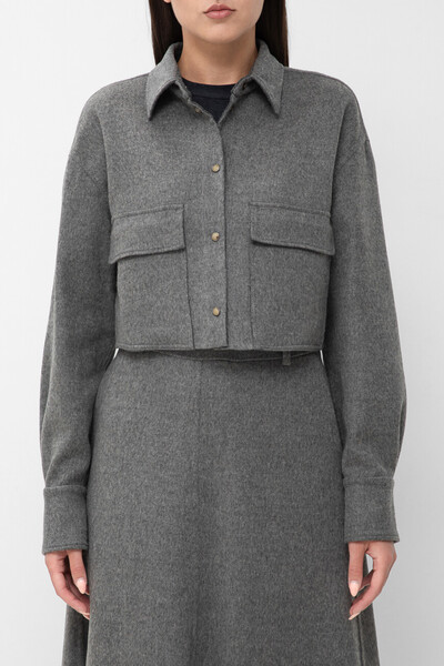 Короткий жакет BRUNELLO CUCINELLI выполнен в стиле рубашки. Фасон изделия из мягкой вирджинской шерсти ручной отделки предполагает застёжку на эмалированные клёпки и наличие двух крупных накладных карманов с клапанами по бокам. Два тончайших слоя ткани изготавливаются одновременно на ткацком станке и объединяются вместе, чтобы обеспечить тепло и комфорт при носке. Принадлежность модели серого цвета Дому деликатно обозначена вставкой из рядов серебристой цепочки Мониль по краю левого кармана. Куртка смотрится органично в комплекте с расклешенной юбкой-миди из той же коллекции.