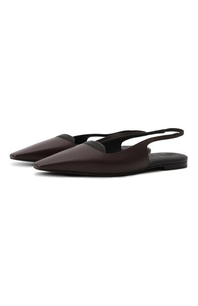 Балетки на едва заметном каблуке изготовили из тонко выделанной кожи. Модель с фигурной деталью из цепочки мониль на союзке дополнили ремешком с эластичной вставкой сзади.