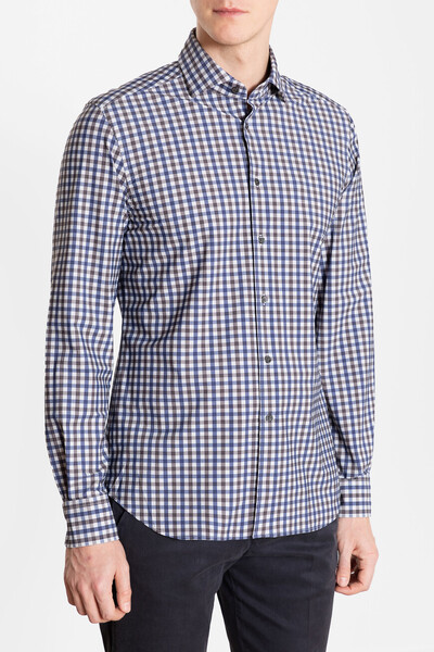 Клетчатая рубашка CORNELIANI — идеальный вариант для повседневного образа. Сорочка полуприталенного кроя изготовлена из качественной синтетической ткани, разработанной по новейшим технологиям. В качестве принта дизайнеры использовали клетку виши с синими и коричневыми полосами. Для создания неформального образа на каждый день носите рубашку с темно-серыми брюками и кардиганом CORNELIANI.