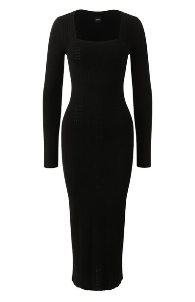 Платье с квадратным вырезом выполнили из вискозного трикотажа с ажурными полосами. Чтобы укрепить материал, в состав добавили полиэстер. Предлагаем сочетать модель с туфлями и сумкой в тон.