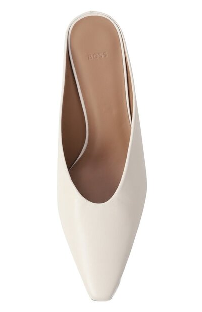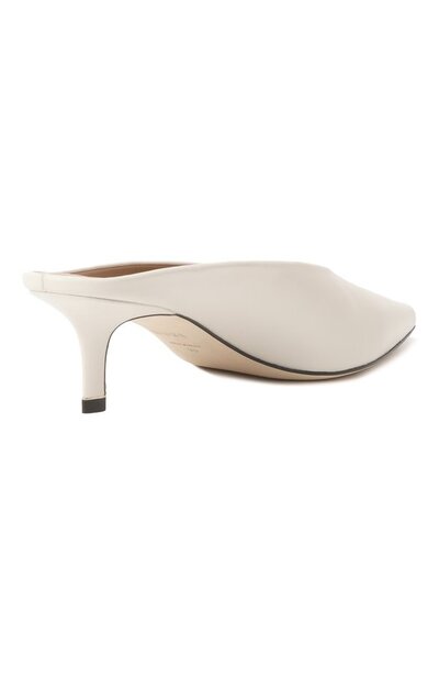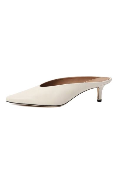Мюли выполнили из гладкой кожи, обтянув ей же каблук средней высоты. Благодаря лаконичному дизайну и базовому оттенку пара впишется в образы разной сложности.